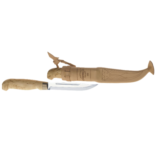 Нож Marttiini Lynx Knife 138 — модель с фиксированным лезвием. Ножи с фиксированным лезвием считаются довольно простым инструментом как в использовании, так и в уходе. Они чаще всего применяются в условиях дикой природы, поэтому крайне удобны, практичны, долговечны. Говоря о рукояти ножа Marttiini Lynx Knife 138, стоит сказать, что она изготовлена из пропитанной воском карельской березы, которая своим рисунком зачастую напоминает мрамор. Именно из-за уникального и оригинального узора, а также прочностных характеристик, это дерево ценится больше всего. Рукояти из такого материала получаются яркими, со светло-коричневым, желтоватым, розоватым и молочно-белым оттенком. Длина рукояти 11 сантиметров. Благодаря множеству переплетений волокон дерева в текстуре карельской березы рукоять из нее получается прочной, ее практически невозможно расколоть. Несмотря на то, что лезвие такого ножа не прячется в рукояти, как у складных ножей, он все равно остается безопасным в использовании и надежным в носке. Все благодаря тому, что финская компания-производитель Marttiini в обязательном порядке прикладывают к нему хорошие кожаные ножны. У модели Marttiini Lynx Knife 138 на ножнах присутствует прижимной ремешок (клипса) для фиксирования ножа на поясе.
