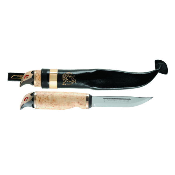 Настоящие ценители холодного оружия теперь могут с восхищением пополнить свой арсенал действительно уникальной моделью-это нож Marttiini Wood Grouse knife, представляющий собой подарочный вариант охотничьего ножа. Особой изюминкой и украшением этой модели является необычный литой наконечник рукояти ножа, изготовленный из бронзы и представляющий собой голову глухаря. Коллекционеры всего мира по достоинству оценили этот оригинальный литой наконечник, выполненный в яркой цветовой гамме по специальной технологии. Лезвие ножа Marttiini Wood Grouse knife создано из высококачественной нержавеющей стали. При этом его длина составляет 11 см, а общая длина 24,5 см. Сам клинок идеально заточен и способен сохранять безупречную остроту очень длительное время. При этом отполированная поверхность клинка не подвержена стиранию и потере блеска.