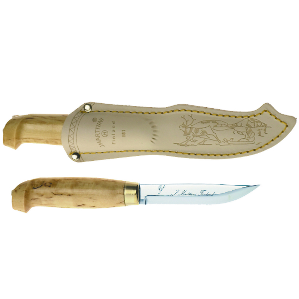 Хорошими режущими свойствами нож Marttiini Lynx Knife 131 обязан ножевой стали, использованной для клинка. Это характерная для продукции Мартиини нержавеющая сталь с тринадцатипроцентной добавкой хрома. Материал обеспечивает клинку: устойчивость к воздействию влаги; долговременную и качественную заточку; приемлемую твердость по Ровеллу (53-54 HRC). Нож Marttiini Lynx Knife 131 имеет типичную бочкообразную рукоять без ограничителей и подпальцевых выемок. Торец с выраженной головкой, спуски к клинковой части плавно перетекают в широкую металлическую оковку с надежным креплением к клинку и рукоятке. Хвостовик на всю длину рукояти, зафиксирован заклепкой на торце. Такая конструкция обеспечивает плотное, надежное соединение, которое не дает люфта после длительного использования с высокими нагрузками. Чехол для ножа Marttiini Lynx Knife 131 имеет оригинальную форму, украшен лапландским орнаментом с типичным для таких изделий логотипом Мартиини и указанием на страну производителя. Ножны пошиты вручную, лицо и задник соединены прочными швами, а устье усилено двумя заклепками. На тыльной стороне расположено прочное кожаное кольцо под широкий поясной ремень. Материалом для чехла служит натуральная, качественно выделанная, кожа, окрашенная под цвет рукоятки.